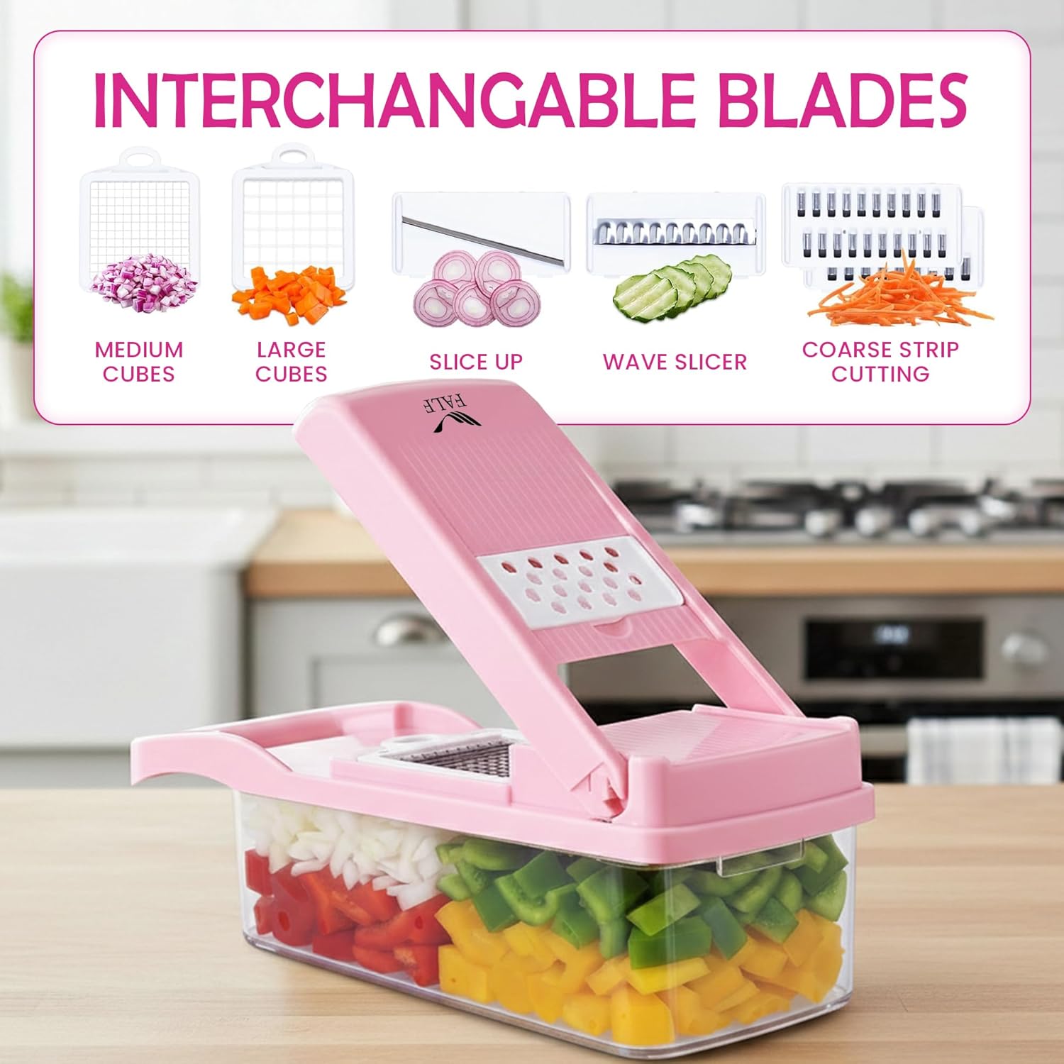 𝐏𝐑𝐄𝐌𝐈𝐔𝐌 12-𝐈𝐍-1 𝐕𝐄𝐆𝐄𝐓𝐀𝐁𝐋𝐄 & 𝐎𝐍𝐈𝐎𝐍 𝐂𝐇𝐎𝐏𝐏𝐄𝐑 – 𝐂𝐎𝐌𝐏𝐋𝐄𝐓𝐄 𝐊𝐈𝐓𝐂𝐇𝐄𝐍 𝐏𝐑𝐄𝐏 𝐒𝐎𝐋𝐔𝐓𝐈𝐎𝐍 Upgrade your cooking experience with the FALF 12-in-1 Vegetable & Onion Chopper with Container. This multifunctional vegetable chopper combines an onion chopper, mandoline slicer, food dicer, and grater in one compact design. Ideal for daily cooking, meal prep, and salad preparation, it helps simplify chopping, slicing, and dicing tasks in any kitchen. 𝐌𝐔𝐋𝐓𝐈𝐅𝐔𝐍𝐂𝐓𝐈𝐎𝐍𝐀𝐋 𝐌𝐀𝐍𝐃𝐎𝐋𝐈𝐍𝐄 𝐒𝐋𝐈𝐂𝐄𝐑 & 𝐅𝐎𝐎𝐃 𝐃𝐈𝐂𝐄𝐑 – 𝐕𝐄𝐑𝐒𝐀𝐓𝐈𝐋𝐄 𝐂𝐔𝐓𝐓𝐈𝐍𝐆 𝐎𝐏𝐓𝐈𝐎𝐍𝐒 Designed with interchangeable blades for slicing, dicing, julienne cutting, shredding, and grating. This manual food chopper easily handles onions, potatoes, carrots, cucumbers, cabbage, garlic, and more. Perfect for preparing salads, stir fry, salsa, and fresh vegetables. 𝐏𝐑𝐄𝐂𝐈𝐒𝐈𝐎𝐍 𝐒𝐓𝐀𝐈𝐍𝐋𝐄𝐒𝐒 𝐒𝐓𝐄𝐄𝐋 𝐁𝐋𝐀𝐃𝐄𝐒 – 𝐂𝐎𝐍𝐒𝐈𝐒𝐓𝐄𝐍𝐓 𝐀𝐍𝐃 𝐄𝐕𝐄𝐍 𝐑𝐄𝐒𝐔𝐋𝐓𝐒 Equipped with durable stainless steel blades for uniform chopping and slicing performance. The sharp cutting design supports efficient vegetable preparation and smooth operation during everyday cooking tasks. 𝐁𝐔𝐈𝐋𝐓-𝐈𝐍 𝐂𝐎𝐍𝐓𝐀𝐈𝐍𝐄𝐑 – 𝐌𝐄𝐒𝐒-𝐅𝐑𝐄𝐄 𝐌𝐄𝐀𝐋 𝐏𝐑𝐄𝐏 The integrated food container collects chopped ingredients directly, helping keep your countertop clean and organized. Easily transfer vegetables from the container to pots, pans, or serving bowls without additional mess. 𝐒𝐀𝐅𝐄, 𝐒𝐓𝐀𝐁𝐋𝐄 & 𝐔𝐒𝐄𝐑-𝐅𝐑𝐈𝐄𝐍𝐃𝐋𝐘 𝐃𝐄𝐒𝐈𝐆𝐍 – 𝐂𝐎𝐍𝐓𝐑𝐎𝐋𝐋𝐄𝐃 𝐂𝐇𝐎𝐏𝐏𝐈𝐍𝐆 Features a non-slip base for stability and a hand guard for better control while slicing and dicing. This manual vegetable cutter offers a practical alternative to bulky kitchen appliances. 𝐃𝐔𝐑𝐀𝐁𝐋𝐄 𝐊𝐈𝐓𝐂𝐇𝐄𝐍 𝐀𝐂𝐂𝐄𝐒𝐒𝐎𝐑𝐘 – 𝐄𝐀𝐒𝐘 𝐓𝐎 𝐂𝐋𝐄𝐀𝐍 & 𝐒𝐓𝐎𝐑𝐄 Made from sturdy food-grade ABS material for reliable everyday use. Removable blades allow thorough cleaning, and the compact design makes storage simple. A practical addition to your kitchen accessories and meal prep essentials.