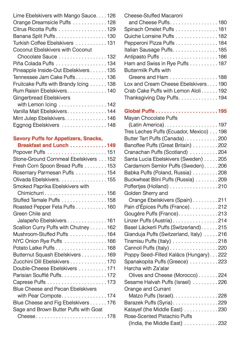 Cranberry Orange Ebelskivers, Buttery Beignet Puffs, Maple-Pecan Ebelskivers Smoked Salmon and Dill Puffs, Roasted Pepper Feta Puffs, Crab Cake Puffs Chocolate Ganache Ebelskivers, Praline Puffs, Browned Butter Ebelskivers Buckwheat Blini Puffs, Lamington Puffs, Spanakopita Puffs, Linzer Puffs.