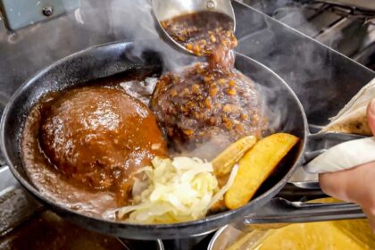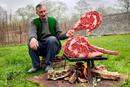 Experience traditional village cooking as thick ribeye steaks are seasoned, seared in butter, and finished on a hot stone over open … source