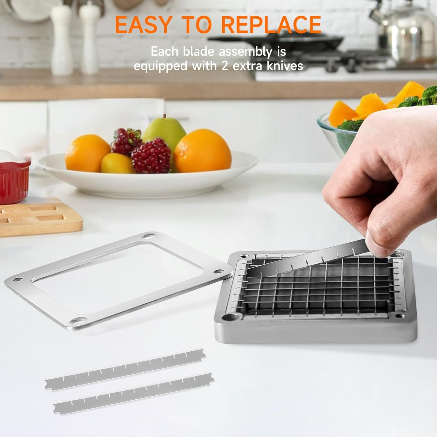 【Durable Stainless Steel Blades】The french fry cutter blade assembly is combining durable stainless steel blade with aluminum alloy frame. It’s rust and corrosion-proof, and built to last! The blades are sharp enough to chop or dice most of vegetable or fruit ingredient with ease.