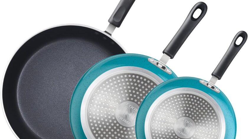 Get excellent performance and durability in cooking with the Cook N Home 3-Piece 8, 9.5, and 11-Inch Non-stick Saute Omelet Fry Pan Skillet Set, Turquoise, 20/24/28 cm. Made of thick gauge aluminum that provides even and quick heat conduction and prevents hot spots. Nonstick coating makes food release, cleaning, flipping, and tossing easy and allows for healthy cooking. Long riveted handle with hole for hanging is comfortable to hold, stays cool, and non-slip; oven safe to 350°F. Flat, wide, and thick bottom for a large cooking surface, is multipurpose, and keeps temperature. Flared sides for pouring, stirring, and sliding food out. Induction compatible. Works on: gas, electric, glass, halogen, ceramic, glass etc. Dishwasher safe.