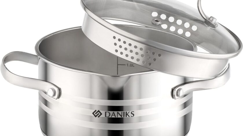 Daniks Tokio Stainless Steel Stock Pot with Glass Strainer Lid – Induction 2 Quart, Dishwasher Safe, Measuring Scale, For Soup, Pasta, Stew, Silver
