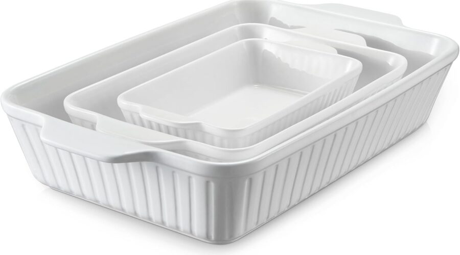 DOWAN Casserole Dishes for Oven, Baking Dishes Set, Ceramic Bakeware Sets of 3, Lasagna Pan Deep, Rectangular Baking Pan Set with Handles for Baking, Casserole, Kitchen, Wedding Gift, White (15.6”/12.2”/8.9”)