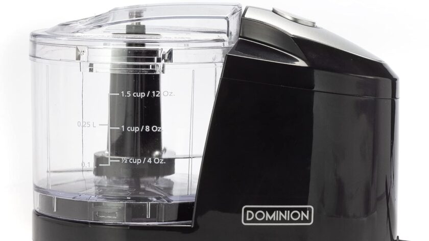 Large detachable chopping container – the Dominion electric food chopper features a large detachable 1 1/2 cup capacity container with an interlocking lid. Additionally, the bowl, lid, and stainless steel blades are dishwasher safe.
