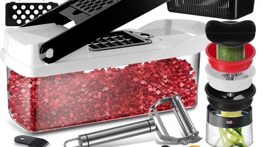 Food Slicer Vegetable Cutter: With sharp stainless-steel blades, ergonomic handle, and non-skid base, this food chopper and slicer is ideal as an onion chopper, salad chopper or vegetable slicer.