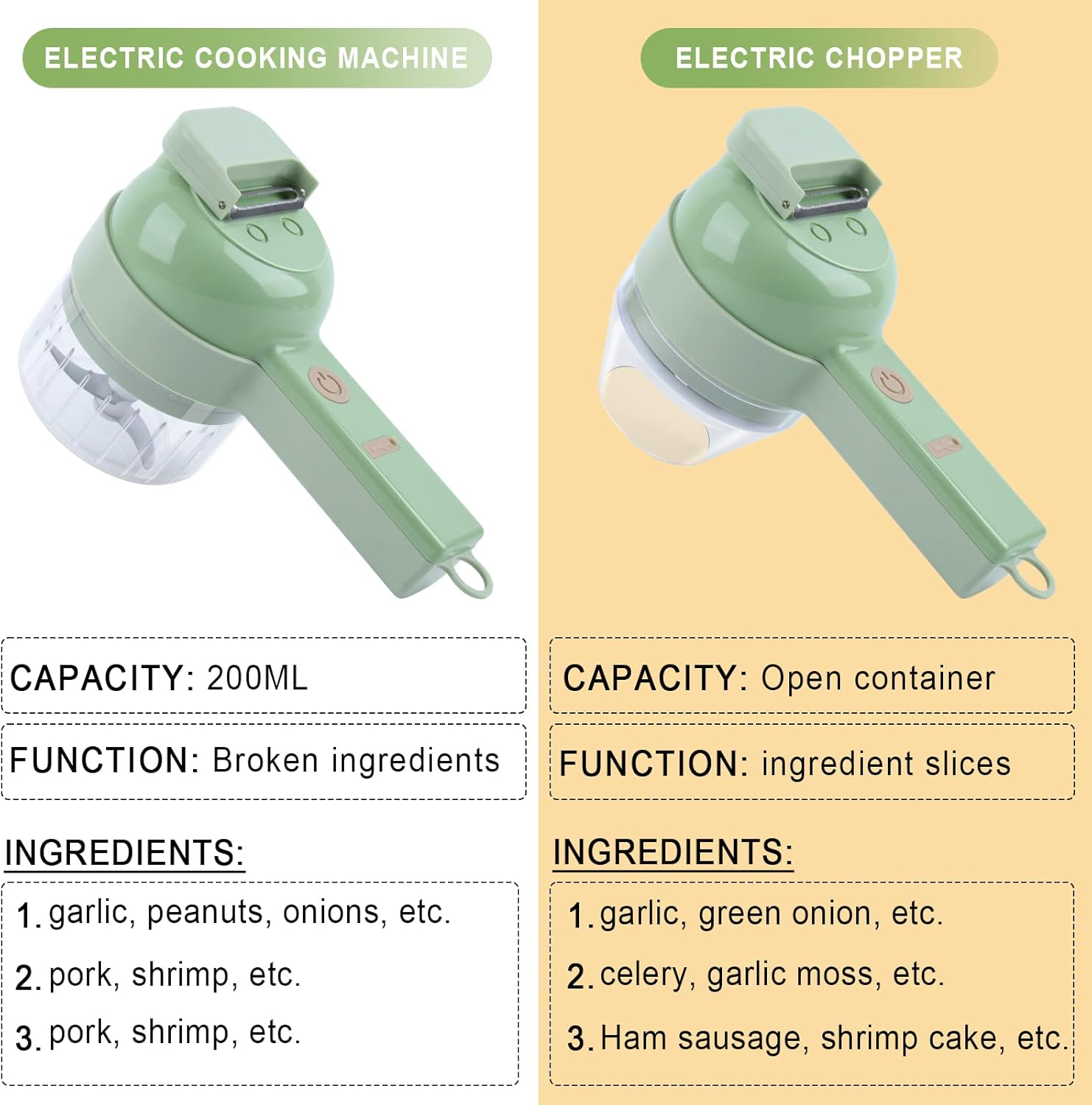 【4 in 1 Electric Vegetable Slicer Set】 The electric vegetable Slicer has the function of slicing, cooking, peeling, and brush. With it, You can cut vegetables and grind meat at the same time.