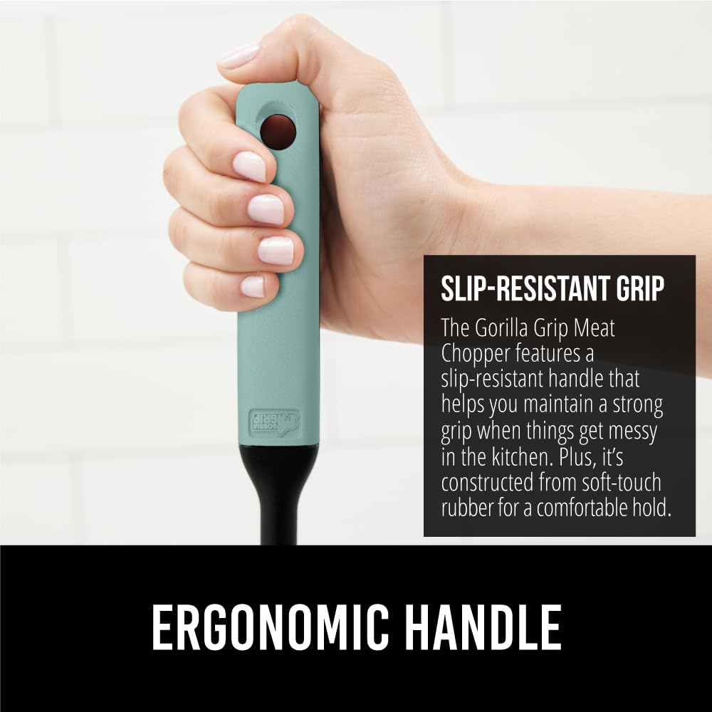 ERGONOMIC, SLIP RESISTANT GRIP HANDLE: break up ground meat easier than ever before; ergonomic handle is constructed from soft touch rubber and is slip resistant for a steady hold