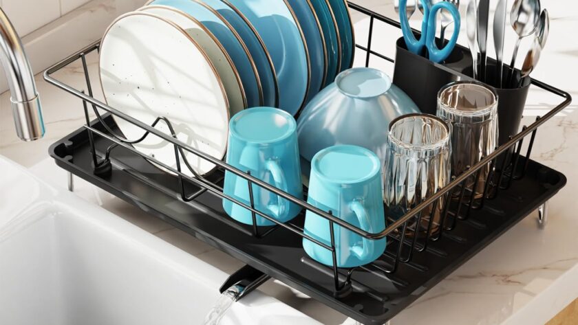 Compact Size & Space-Saving: 16.5”x11.8”x5.5”, Ideal for 1-2 person households, this dish drainer for kitchen counter can store knives, forks, up to 8 plates (within 11″), and allows for stacking salad bowls, thick plates, glassware, and mugs as needed. GSlife 1 tier dish rack eliminates the height restrictions that come with 2 tier rack, making it a convenient addition to any kitchen