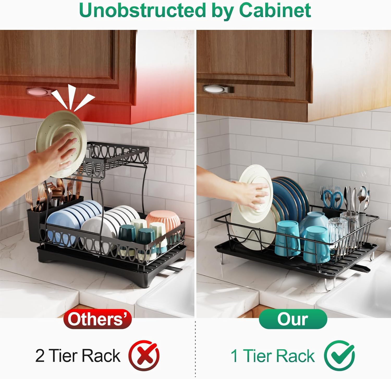 Effortless Drainage System: Unlike traditional 1-tier racks that need manual draining, GSlife dish rack features a drip tray with a 360° rotating and extendable drainage pipe. You can effortlessly customize the drainage direction to match your sink’s layout, which helps reduce water accumulation, contributing to a neater and drier countertop