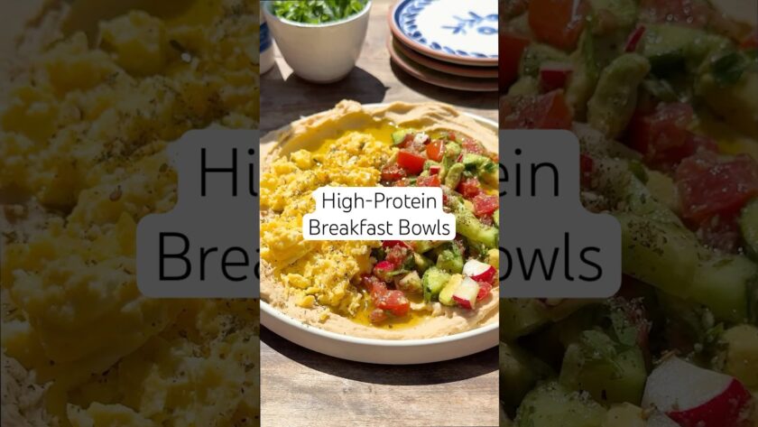 High-Protein Mediterranean Breakfast Bowls with hummus, Mediterranean salad and scrambled egs with Greek yogurt. Are you …