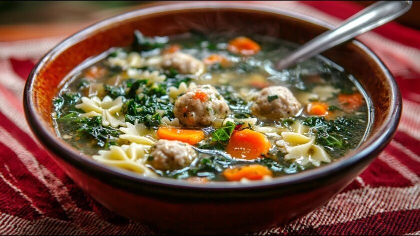 This hearty Italian wedding soup combines flavorful turkey meatballs, escarole, and vegetables in a savory chicken broth.