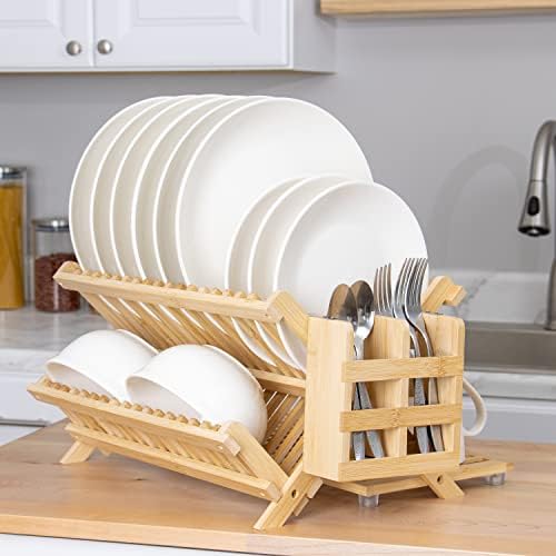 3 TIER CAPACITY: The three tiers of this bamboo drying rack make it the ideal solution for drying a variety of items. The top tier is great for holding large dinner plates, and has 18 V-shaped dish holder slots. The narrow middle tier is great for smaller items like cups and mugs, and can hold 3-4 large (16oz) mugs. The bottom tier is flat and wide, perfect for holding 2-3 bowl. Lastly, the 2 section utensil holder can hold a whole bunch of cutlery, and also has drainage holes on the bottom.