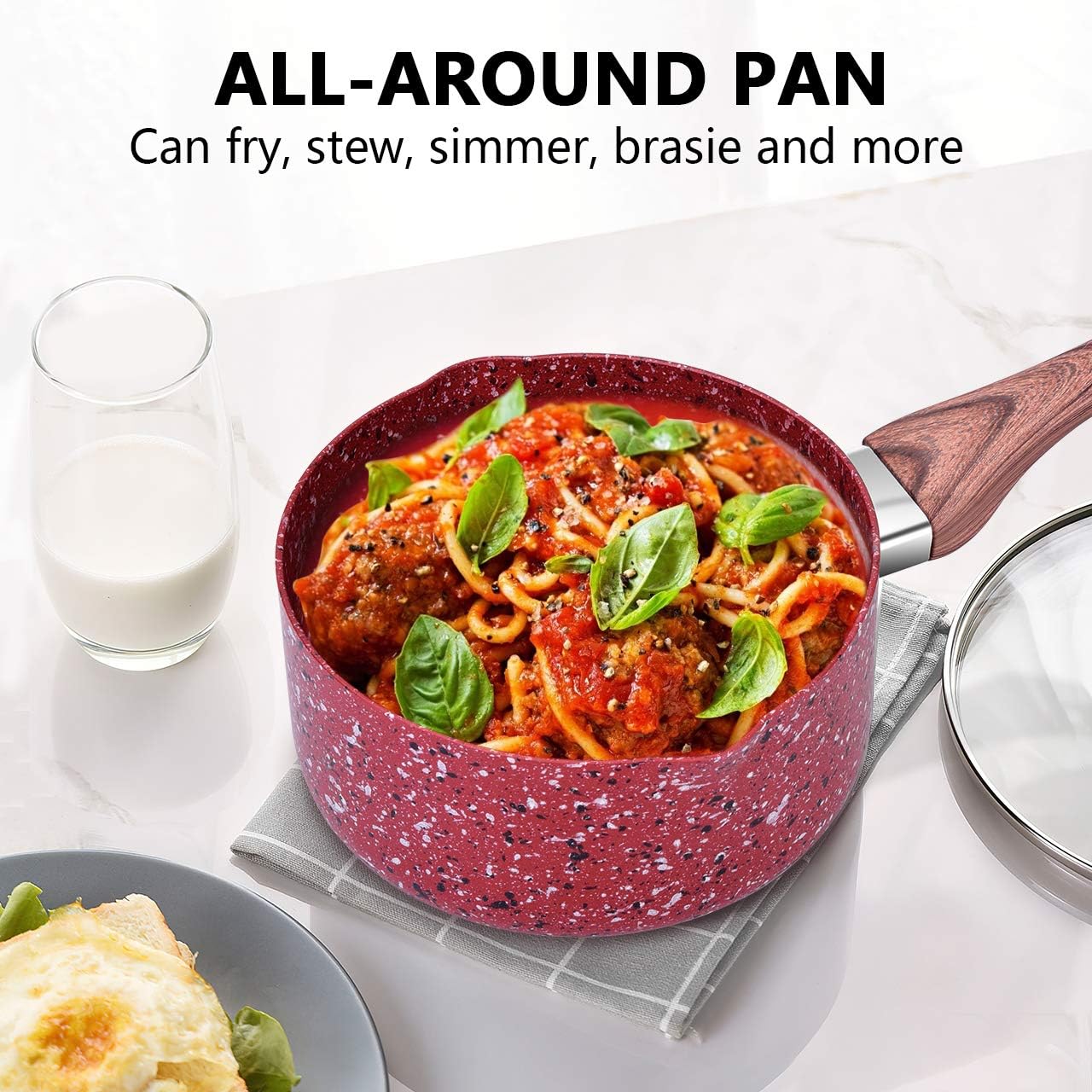 [Breathable glass Lid & Pour Spouts] – Pan also needs breathing! Pan lid could keep the heat in food when steaming or simmering. The vent hole allows steam to escape and effectively prevents food from spilling so as to make the cooking process safer. At the same time, it seals in the flavor and nutrients for healthier and better-tasting food. Moreover, the two Pour Spouts can effectively prevent the food from sticking to the pot wall or sprinkling on the counter, making it simple to pour food.