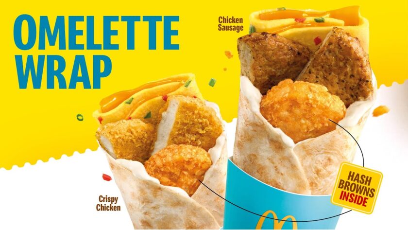 Golden crispy Hash Browns wrapped in soft cheesy omelette paired together with juicy grilled chicken sausage or crispy chicken …