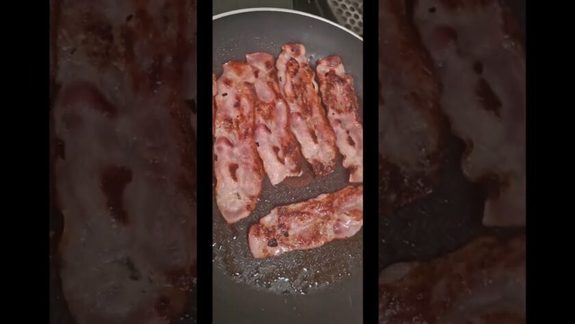 A woman cooks bacon and eggs on toast while in Greece. She fries the bacon in a pan without oil, and then toasts bread on a …