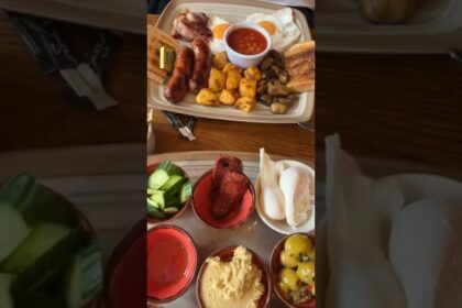 Includes eggs,olives,feta cheese,jam,honey,tomato,cucumber. source