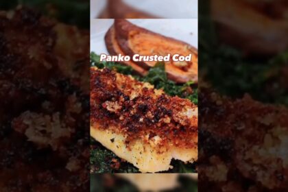 Panko Crusted Cod w/ Roasted Sweet Potato and Sauteed Kaleโ #fishrecipe … source