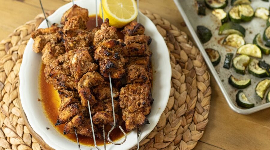 Mediterranean Chicken Skewers in the Air Fryer (with Tomato Feta Salad!)