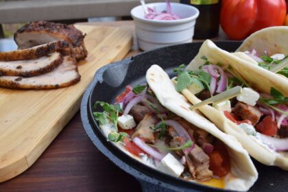 MTCC Mediterranean pork belly gyros, crunchy red onions, marinated tomatoes, tzatziki & feta on homemade BBQ flatbread Pork … source