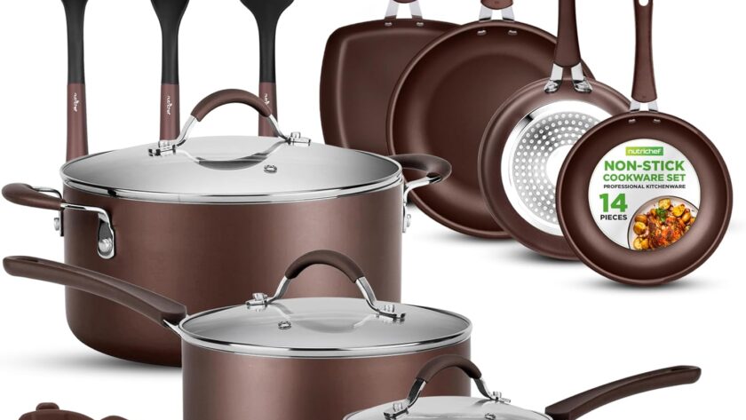 14-PIECE SET: NutriChef offers a 14-piece nonstick cookware set which includes 1.5qt & 2.5qt sauce pots w/ lids, 5qt dutch oven pot w/ lid, 12” large fry pan, 10” medium fry pan, 8” small fry pan, soup ladle, pasta fork, spatula, and strainer