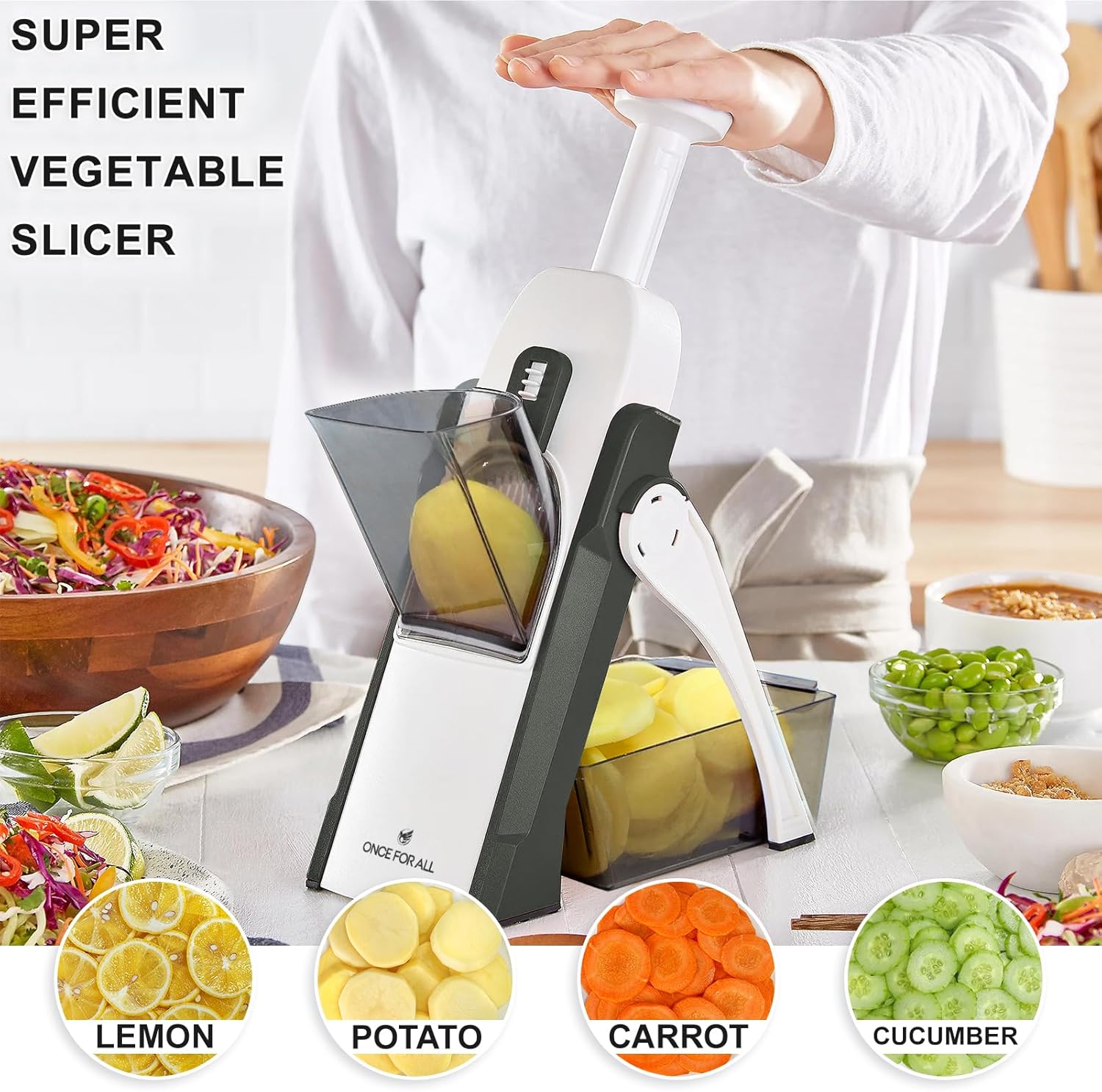 VERSATILE: ONCE FOR ALL’s vegetable slicer offers 8 mode of thickness for slicing at once no need to change the blade. Adjustable thickness 0.1-8mm great for quickly slicing potatoes, carrots, cucumbers, onions…