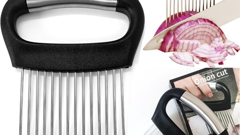 Multipurpose Onion Slicer and Meat Tenderizer Tool: This professional-grade onion holder features 14 stainless steel needles that securely grip onions for perfect, even slices every time. Ideal for slicing tomatoes, potatoes, avocados while doubling as an effective meat tenderizer. Includes a storage cover for convenient organization and hygiene maintenance in your kitchen