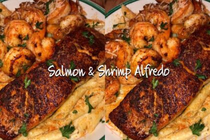 Salmon & Shrimp Alfredo Recipe 1/2 pound raw Shrimp, peeled/deveined 2 salmon fillets (4-6 ounces) 6-8 oz parmsean cheese … source