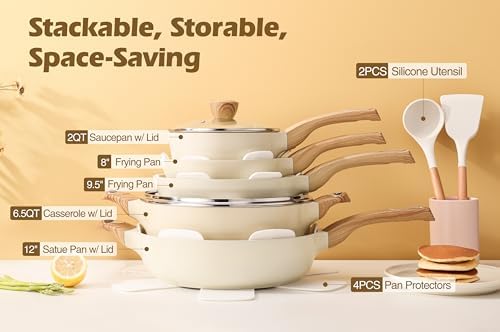 14 Piece White Cookware Set Includes – 8 inch & 9.5 inch frying pan set, 12inch/5Qt saute pan with lid, 6.5Qt casserole with lid, 2Qt saucepan with lid, 2pcs multi-purpose utensils, 4pcs pot protectors.