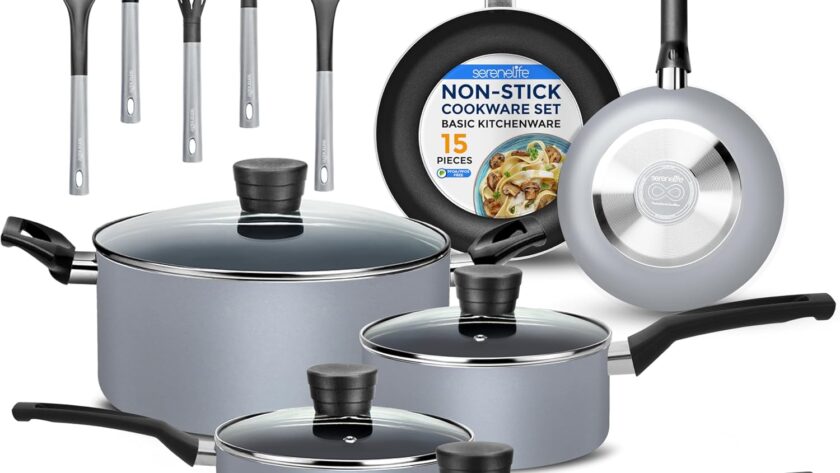 15-PIECE SET: The SereneLife Cookware Set features 15pc nonstick cookware set which includes 0.89 & 1.90qt sauce pots w/ lids, 4.70qt dutch oven pot w/ lid, 2.5qt saute pan w/ lid, 8” & 10” fry pans, spoon, spatula, pasta server, ladle, and egg whisk