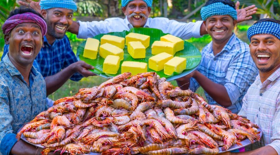 BUTTER GARLIC PRAWNS | Shrimp Roast with Butter | Spicy Prawn Recipe Cooking in Village