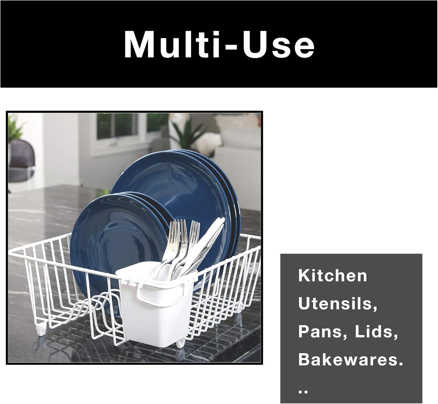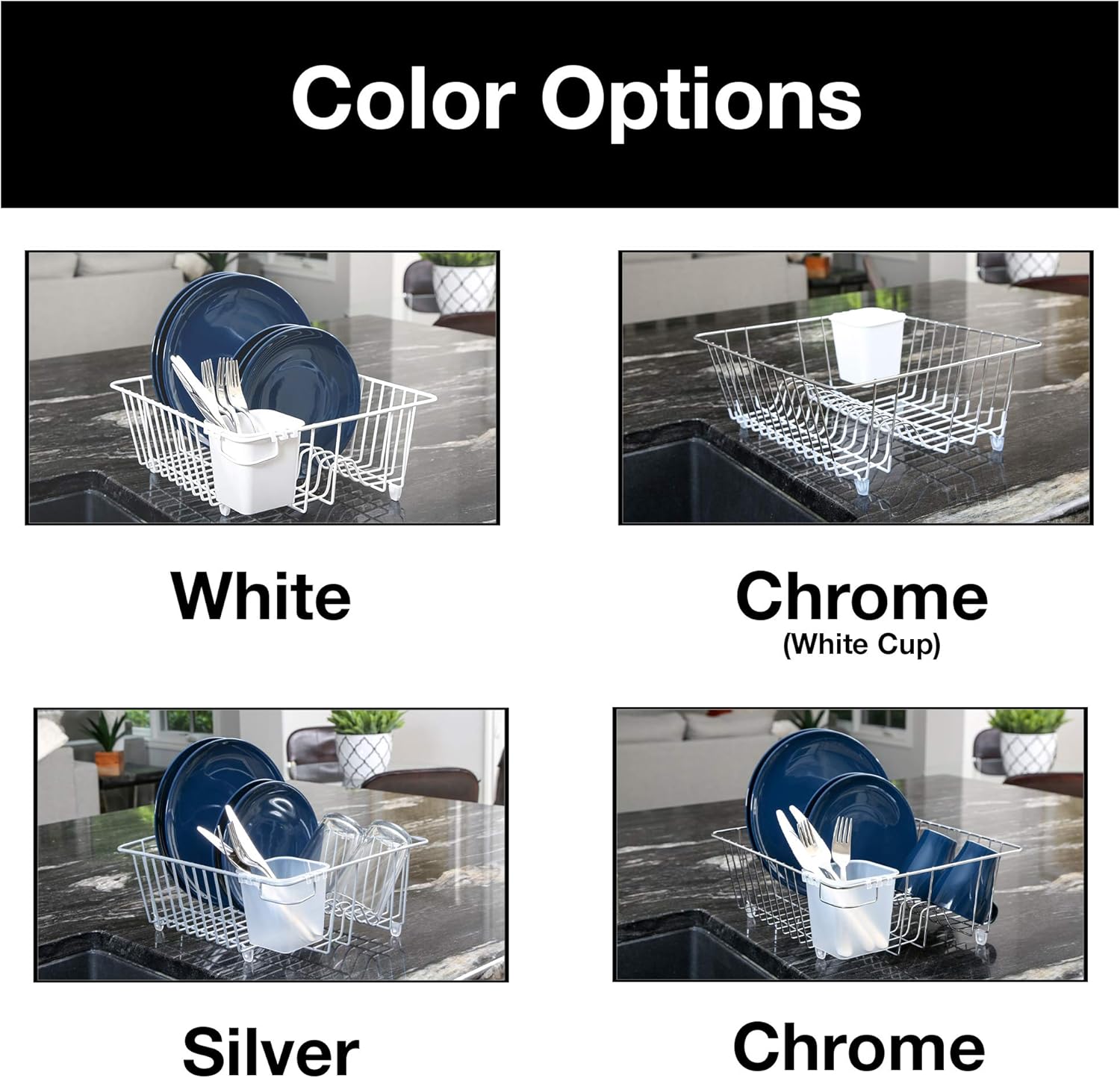 Includes a plastic cutlery cup for organizing and drying your silverware.