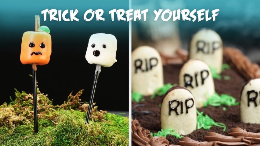 0:00 Intro 00:10 Cute Halloween Marsh-Monsters 00:51 “Worms and Dirt” Poke Box Cake 02:12 Chocolate Cake Graveyard 02:55 …