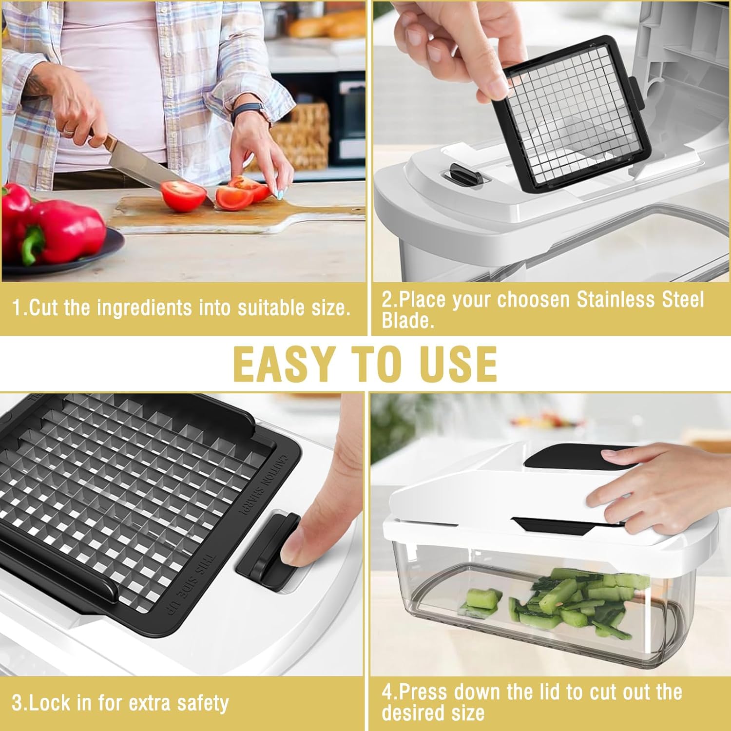 Please Take Attention: The onion cutter with stainless steel blades are high quality and razor sharp; Please take carefully when you are using or changing the blades; Adopt with stainless steel blades retain razor sharpness for crisp, smooth dicing