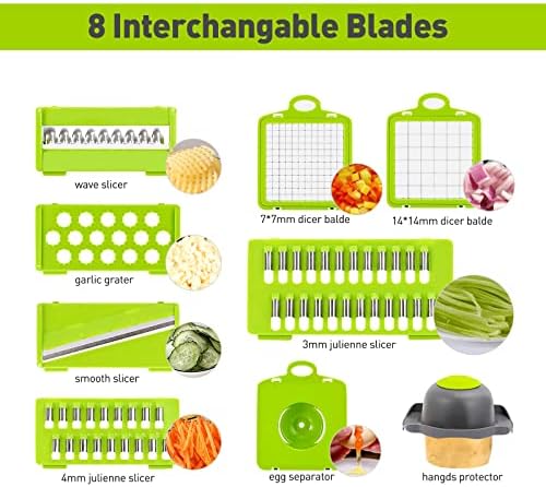 7 DIVERSIFIED BLADES – vegetable chopper slicer contains5 interchangeable blades, which can be used for slicing, cut into large or small pieces, thick or thin Cut into thin slices and two different sizes of chopping blades , the vegetable chopper only needs multifunctional kitchen tools to provide various kitchen tool functions.