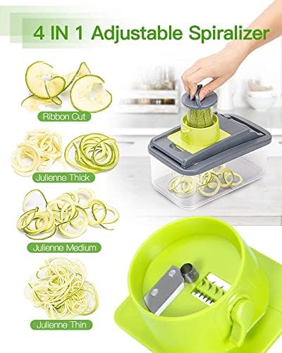 [Thoughtful Design and Extra Accessories]-As you can see the vegetable chopper with container sets include a safety hand guard and a pair of gloves, which protect your finger from hurt. The spiralizer just only needs to change the blade by rotating the switch next to it. Such as the vegetable peeler can be used to remove the skin of some vegetables and fruits.if we just need egg yolk, we can use the egg white separator.
